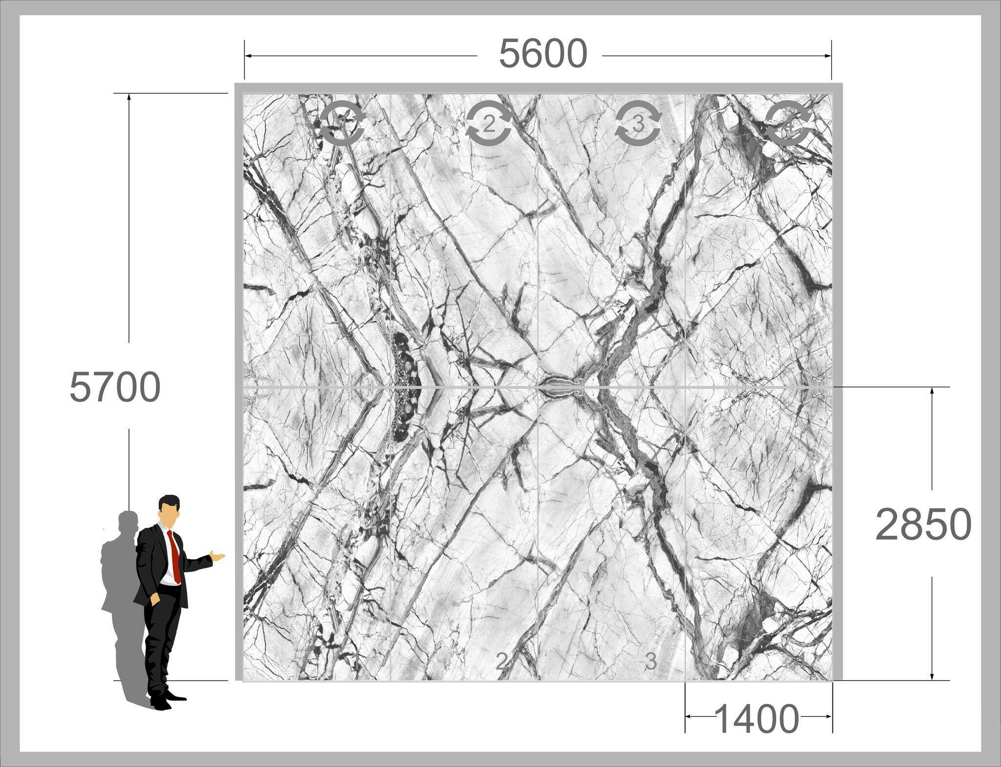 Гибкий мрамор серии ВИП представлен в четырех различных рисунках, каждый из которых имеет размер 285х140 см (за исключением "Волокас", "Доломит" и "Имперадор"). При правильной укладке рисунок 1, 2, 3 и 4 образуют единое полотно без видимых стыков, что позволяет наслаждаться внешним видом покрытия до 50 лет!