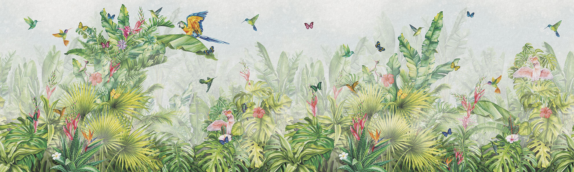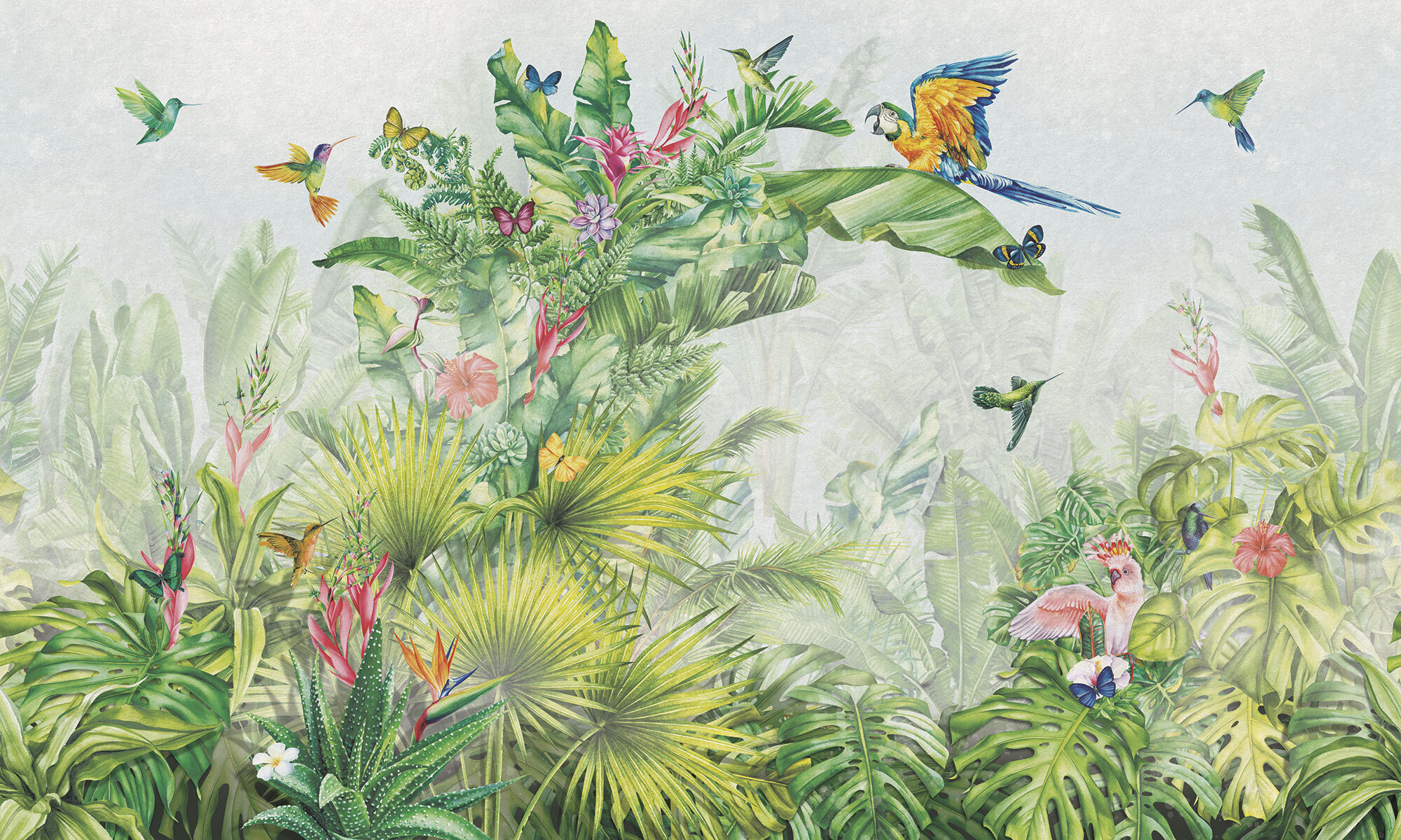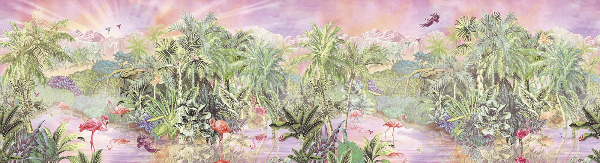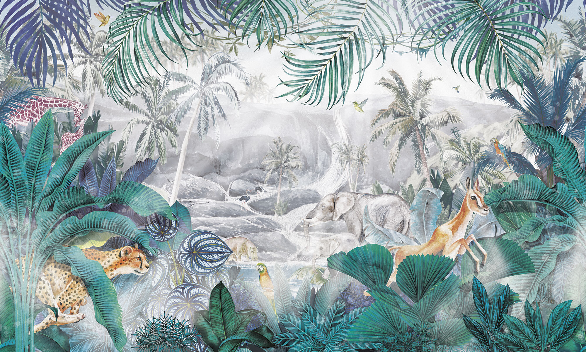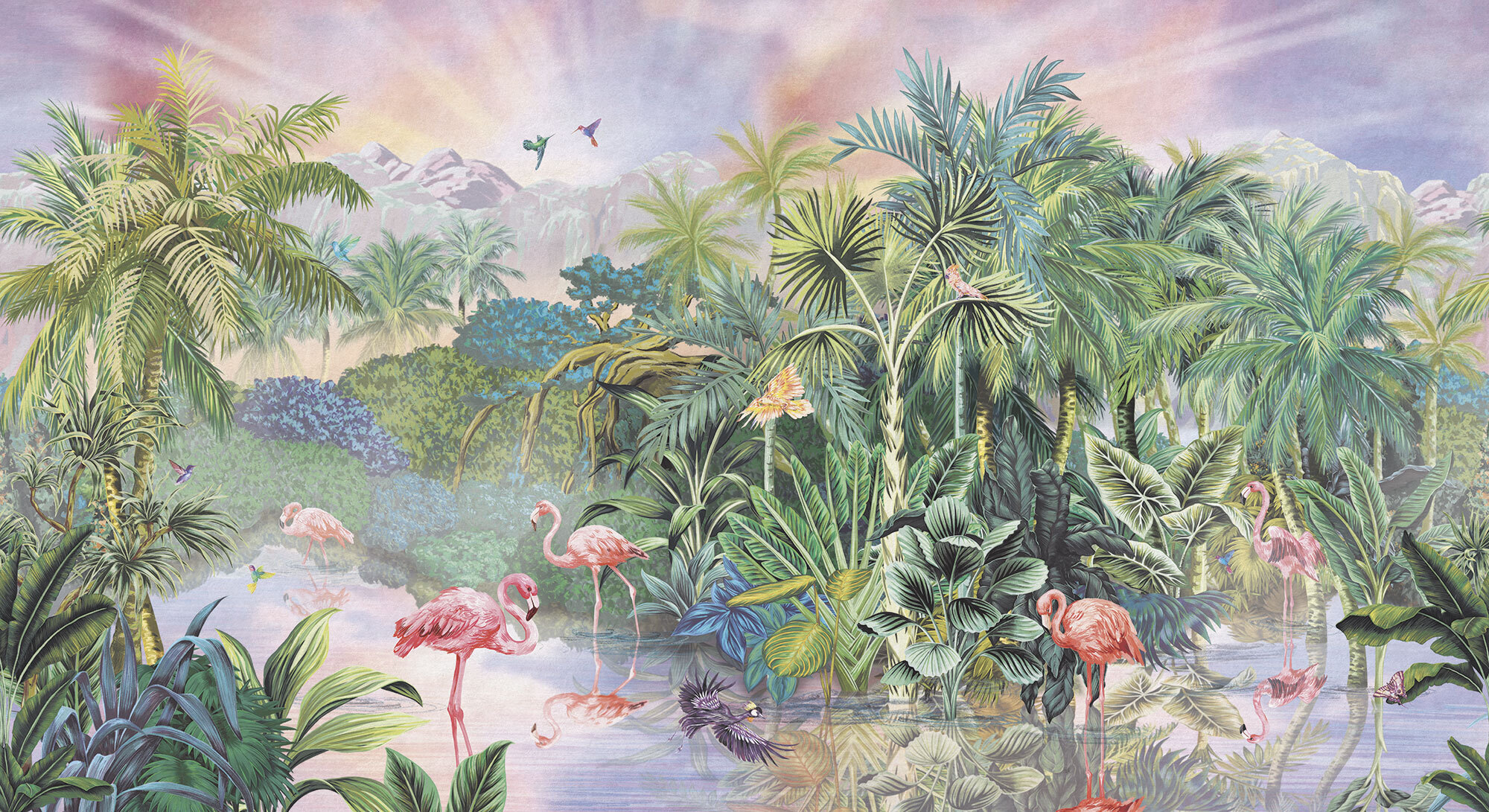 В новой коллекции «It`s Jungle» вы найдёте панорамные тропические пейзажи, которые поражают своей глубиной и «живой» перспективой, а также тщательной прорисовкой и цветовой гармонией. Каждый сюжет позволит вам почувствовать близость к дикой природе: ощутить освежающую прохладу тенистых зарослей или палящий полуденный зной, встречать рассветы и закаты в компании изящных фламинго, игривых попугаев и других обитателей тропического леса.