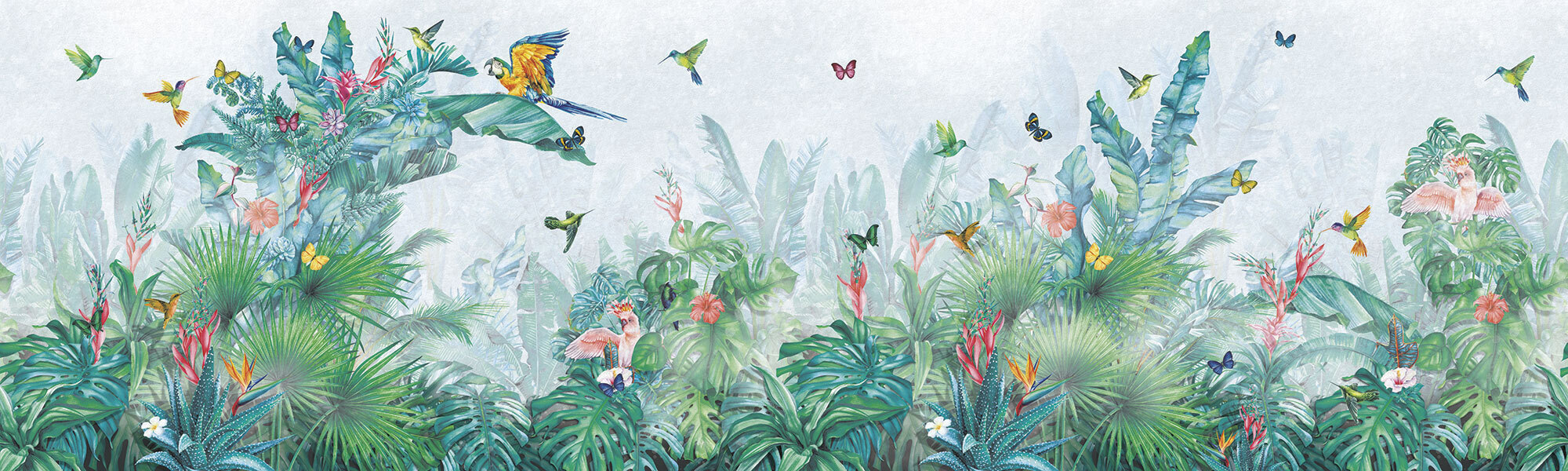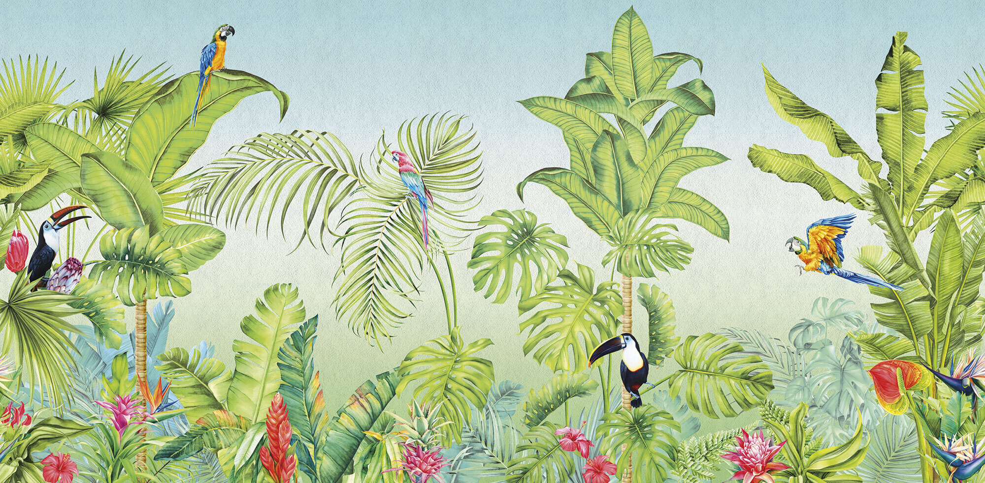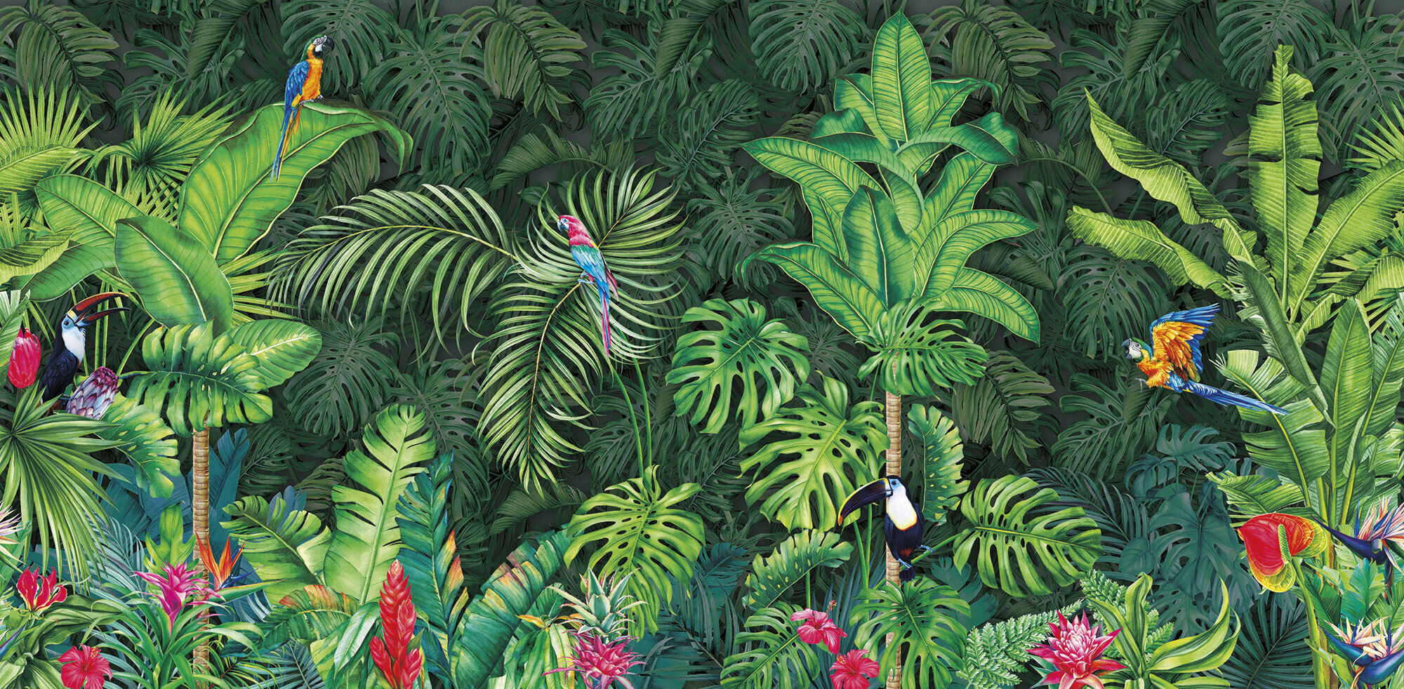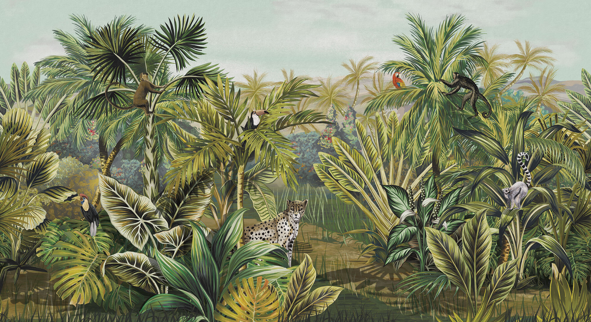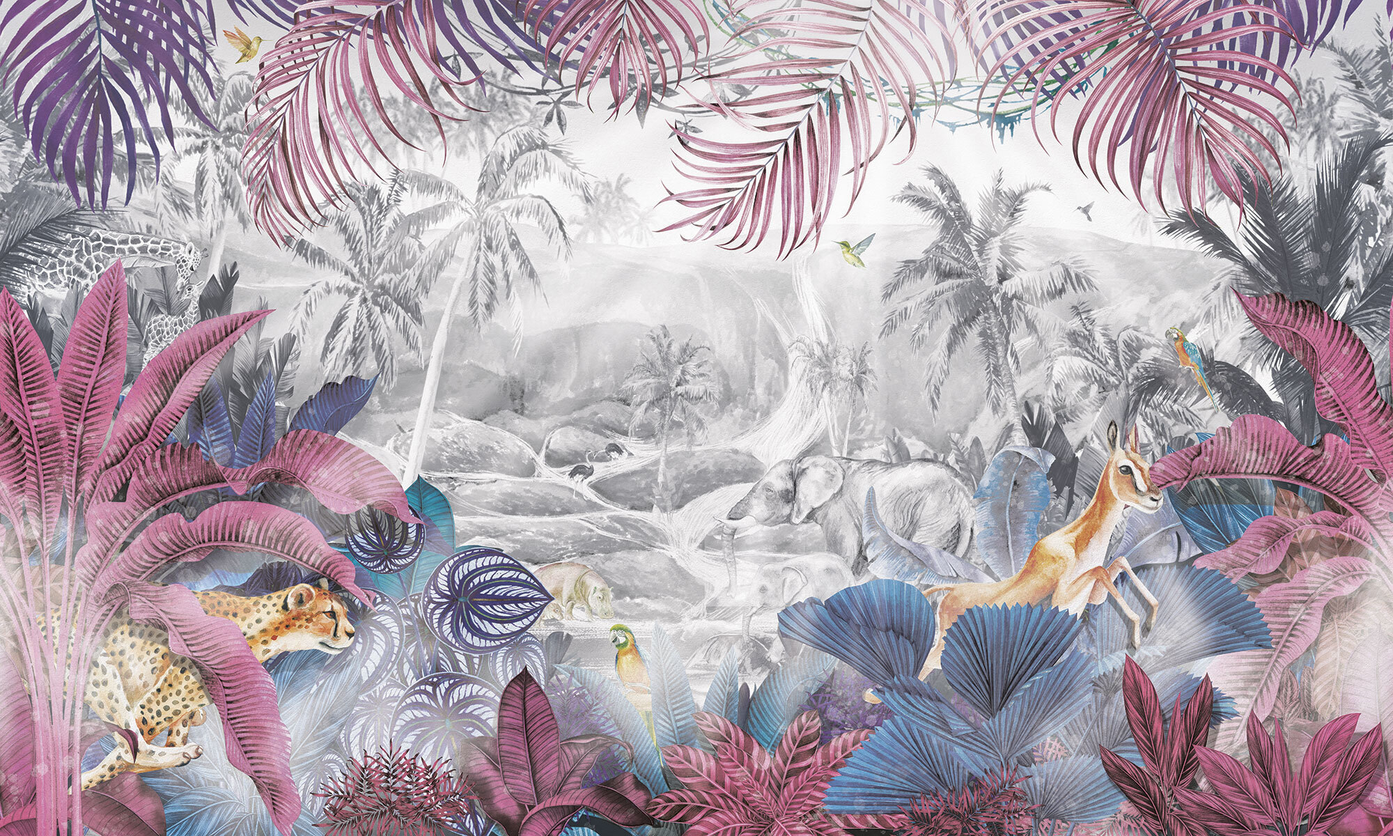 В новой коллекции «It`s Jungle» вы найдёте панорамные тропические пейзажи, которые поражают своей глубиной и «живой» перспективой, а также тщательной прорисовкой и цветовой гармонией. Каждый сюжет позволит вам почувствовать близость к дикой природе: ощутить освежающую прохладу тенистых зарослей или палящий полуденный зной, встречать рассветы и закаты в компании изящных фламинго, игривых попугаев и других обитателей тропического леса.
