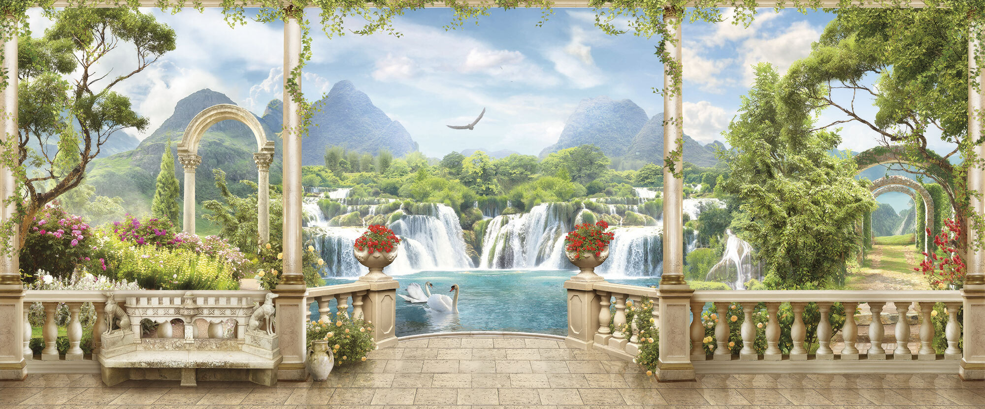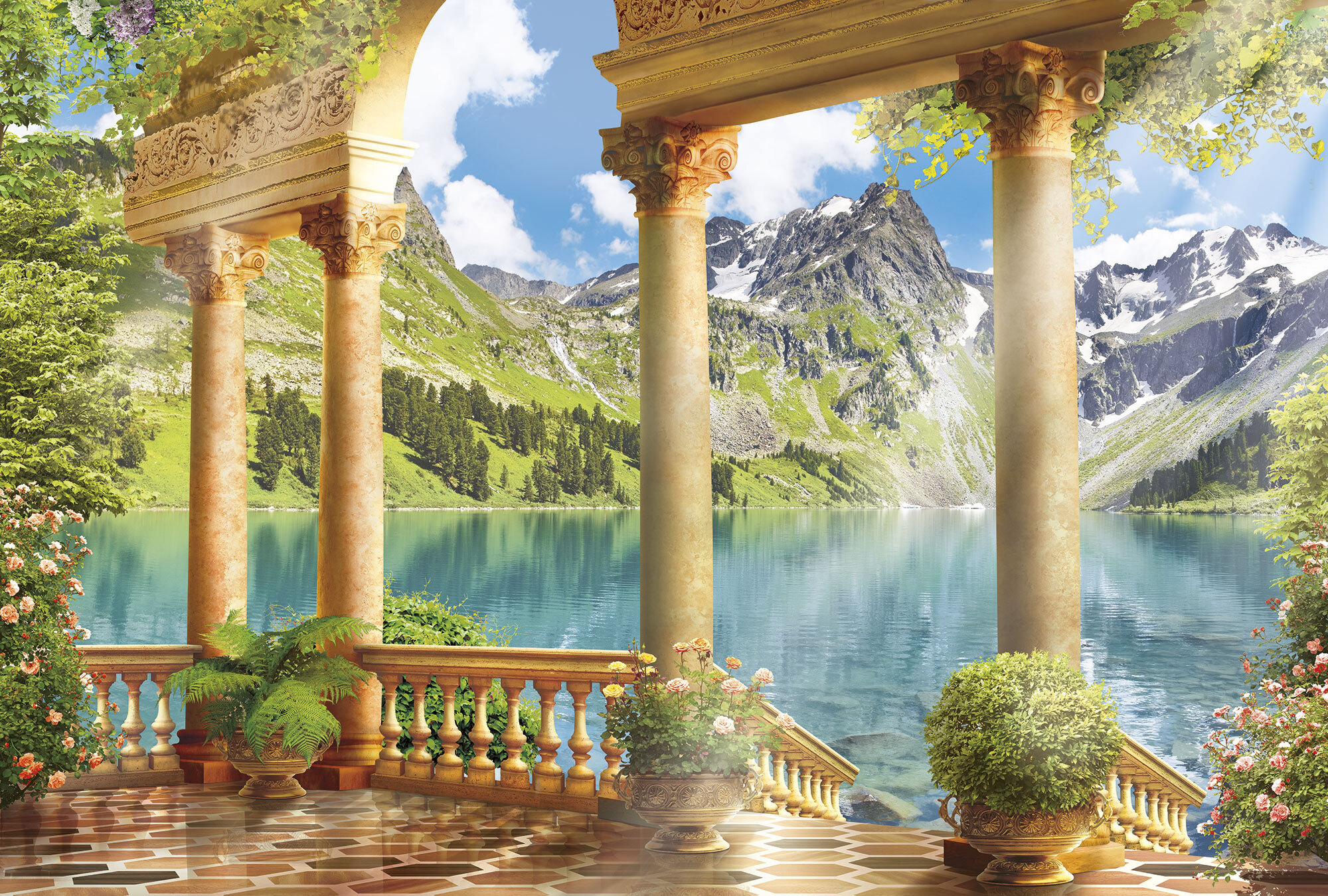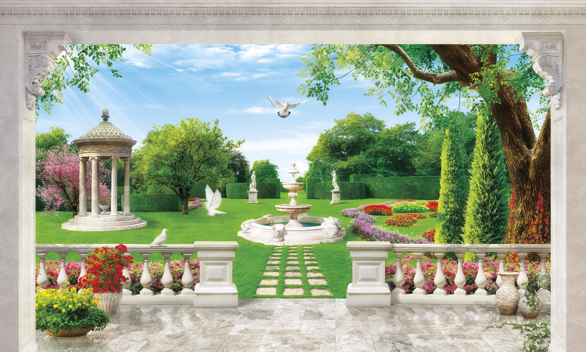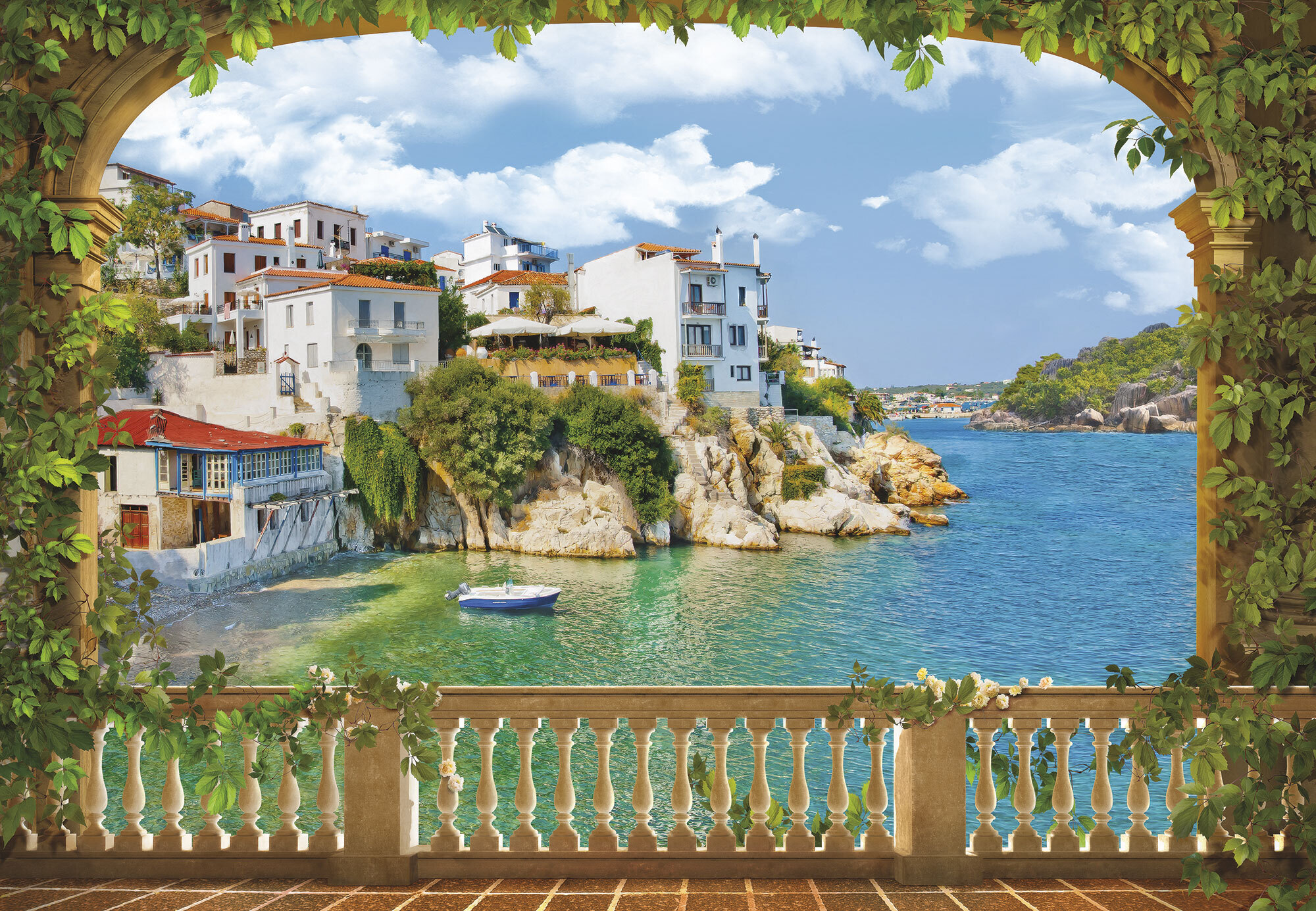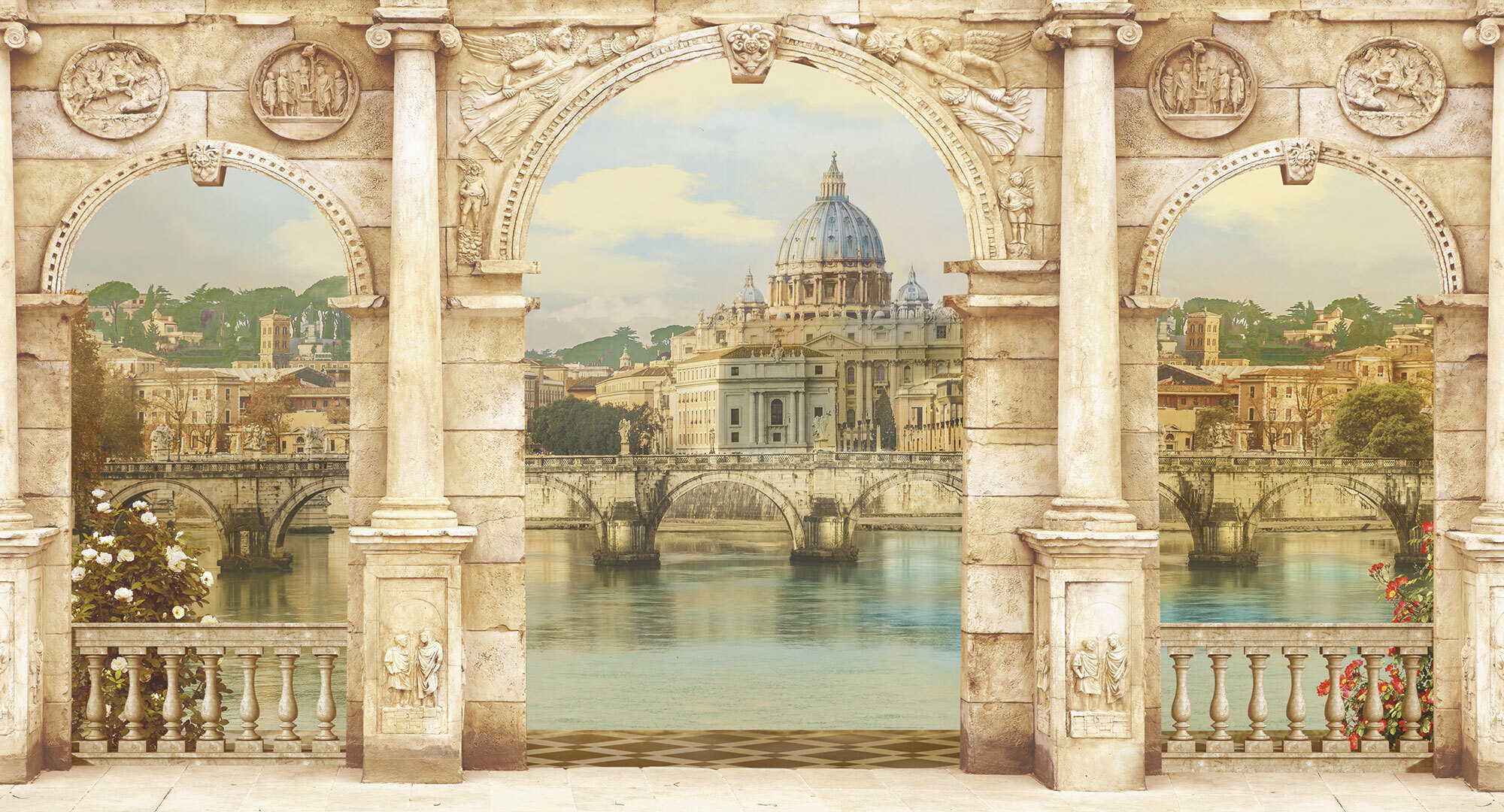 Если вам не повезло с видом из окна или же его вовсе нет, компания ОРТОГРАФ предлагает отличное решение. Коллекция изображений «Обманки» станет для вас своеобразным пространственным порталом. Разместив фреску или фотообои с таким изображением на стене, вы словно перенесётесь на террасы старинных замков, в бальные залы или на балконы с видом на лазурное море.