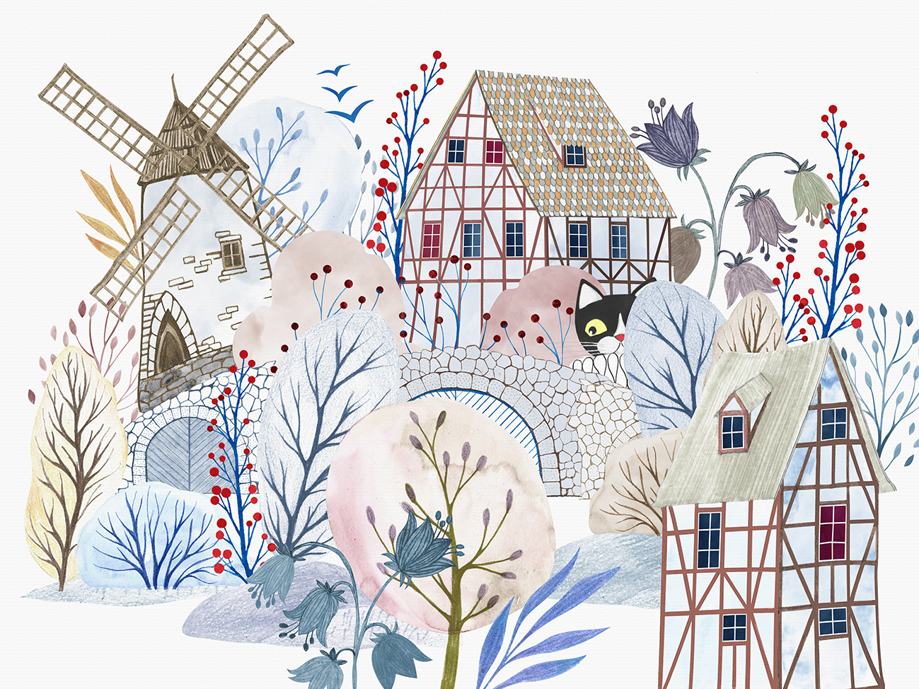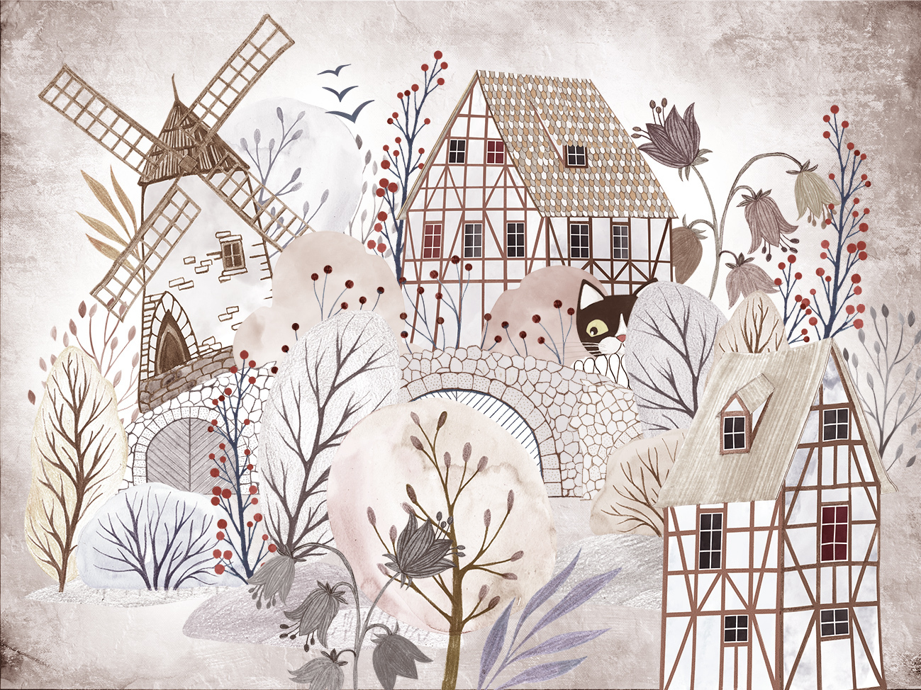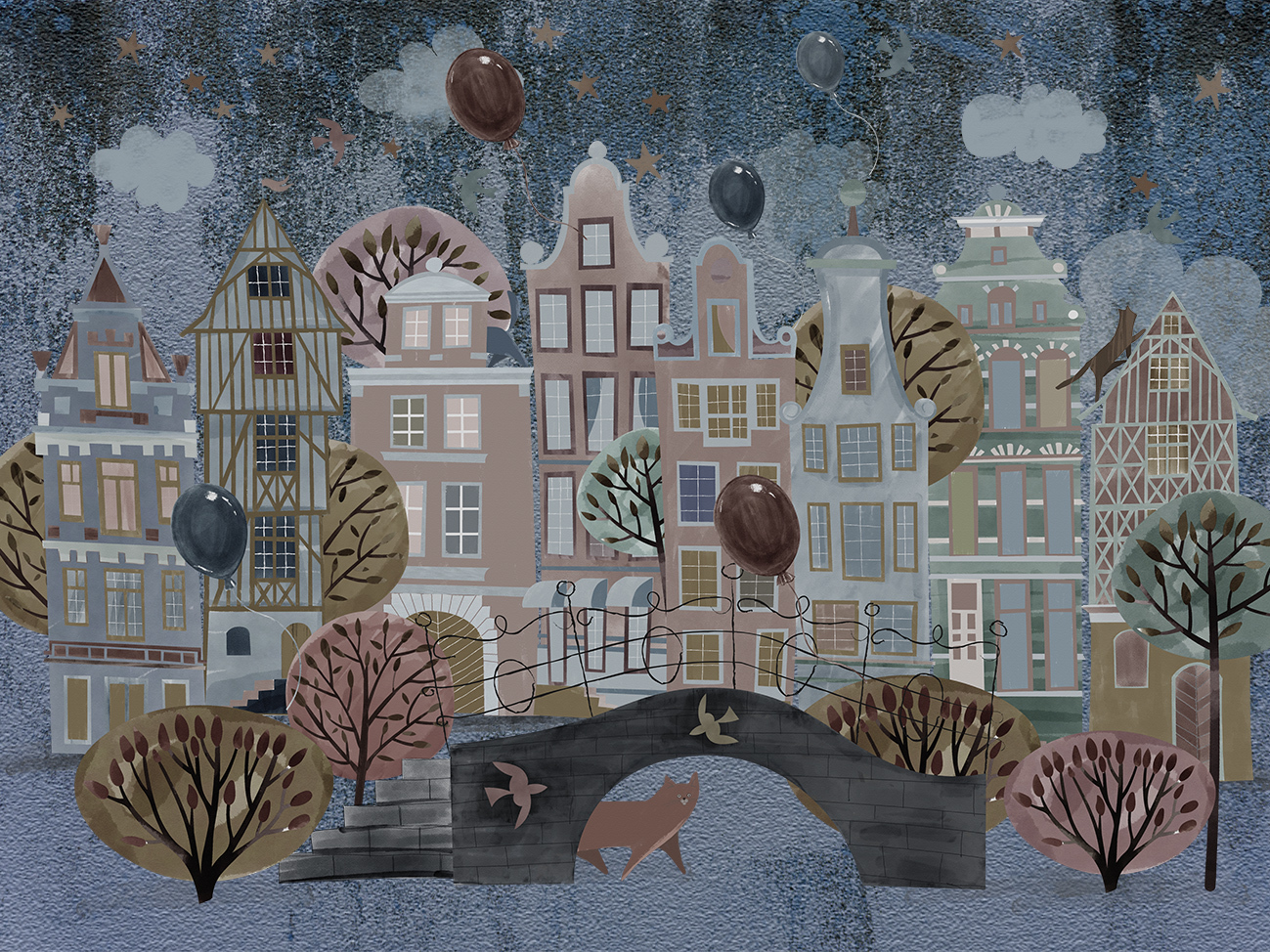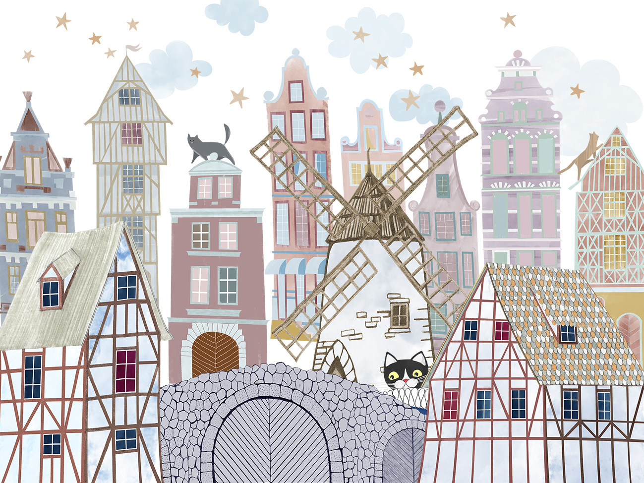 Пастельные тона, городские и природные сюжеты, а также неизменный главный герой — Кот, который прячется от взрослых. Если вы хотите подарить ребёнку сказку, эти обои станут отличным выбором!