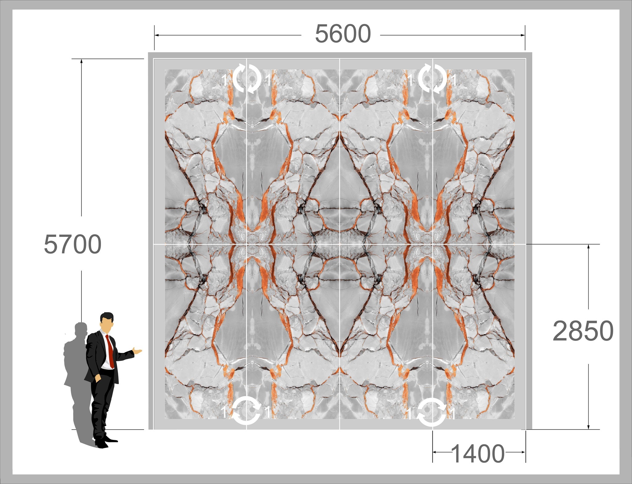 Наш гибкий мрамор, созданный с использованием современных технологий, с точностью повторяет природный узор камня, но при этом стоит гораздо меньше. При соблюдении правил укладки, вы получите целостное покрытие, которое будет выглядеть как настоящий мрамор. Например, используя четырехкратный рисунок укладки, можно создать иллюзию непрерывного мраморного орнамента.